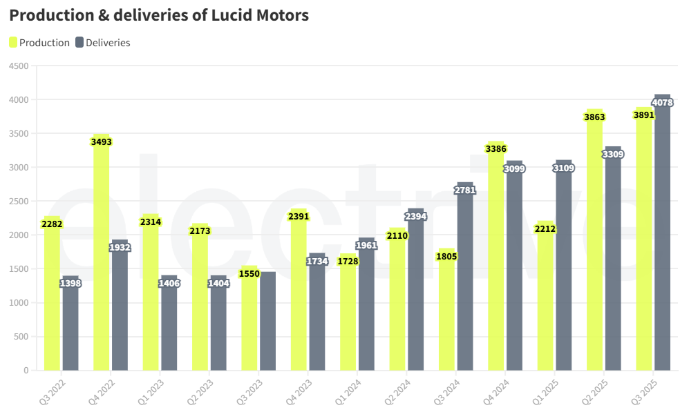 For the quarter ending September 30, Lucid delivered 4,078 vehicles, representing a 23% increase QoQ compared to Q2 FY25 and a 46% increase YoY compared to Q3 FY24. In the same period, Lucid produced 3,891 vehicles, representing an 115% increase YoY in production compared to Q3… pic.twitter.com/B66Q0Nf0r5